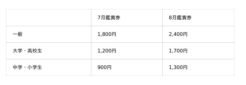 *障がい者手帳のご提示で、ご本人様とお付き添いの方1名様は半額となります。当日窓口にてご購入ください。(7月鑑賞券:一般900円、大学・高校生600円、中学・小学生450円 8月鑑賞券:一般1,200円、大学・高校生850円、中学・小学生650円)