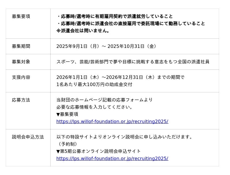 ウィルグループの夢や目標に挑戦する派遣社員を支援する、一般財団法人WILLOF財団(所在地:東京都新宿区、代表理事:村上 秀夫、以下「ウィルオブ財団」)は、派遣社員として働きながら「スポーツ・芸能/芸術部門」で夢の実現に向けて活動している全国約191万人※の派遣社員(派遣会社を問わず)を対象に、活動資金を支援する第5期支援対象者の公募を2025年9月1日(月)から10月31日(金)まで実施します。支援対象となった”夢追う派遣社員” には、2026年1月より最大100万円の活動資金を支援します。また、希望者を対象としたオンライン説明会(予約制)も開催します。