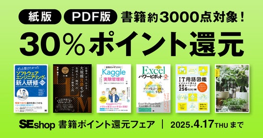株式会社翔泳社(本社:東京都新宿区⾈町5、社長:臼井かおる)の運営する公式通販サイトSEshopは、2025年4月11日(金)から4月17日(木) まで、紙版書籍・PDF版電子書籍の新刊含む約3000タイトルが30%ポイント還元となる「書籍ポイント還元フェア」を開催します。