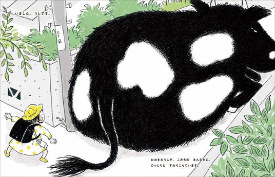ともちゃんが泣きながら角を曲がると、おおきなうしが、こみちの真ん中に、のっしりとすわりこんでいました!