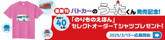 『パトカーの うーたくん』の発売を記念して、「のりものえほん」シリーズキャンペーンが3/13より開始!「のりものえほん」シリーズの、えらべるTシャツを40名様にプレゼントします! 詳細は絵本についている帯をご覧ください。