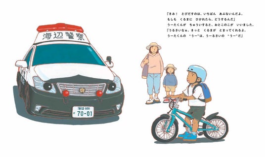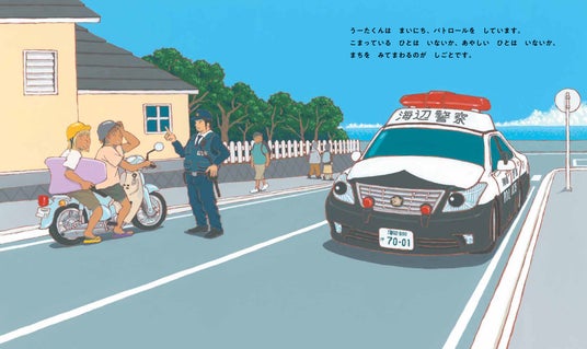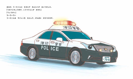 パトカーのうーたくんの仕事は、海辺の町の安全を守ること。