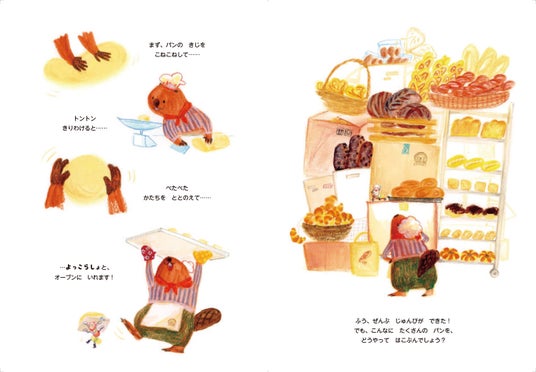 パン屋のビーバーさんのお店はいいにおいでいっぱい。ビーバーさんは、がんばっていろんなパンを焼いています。