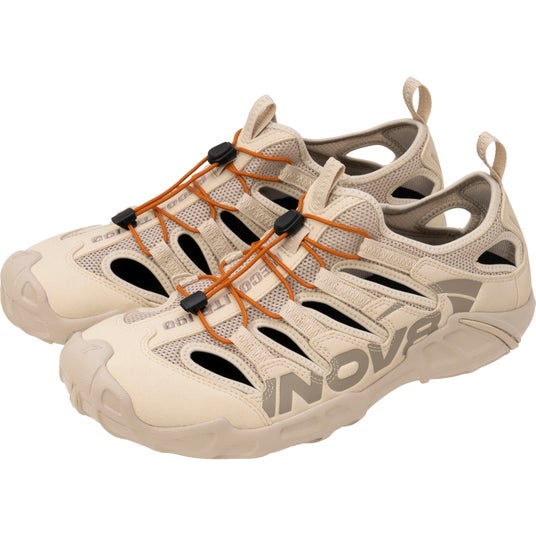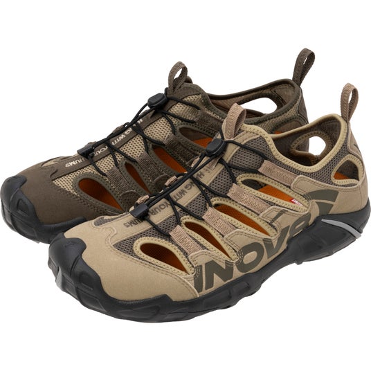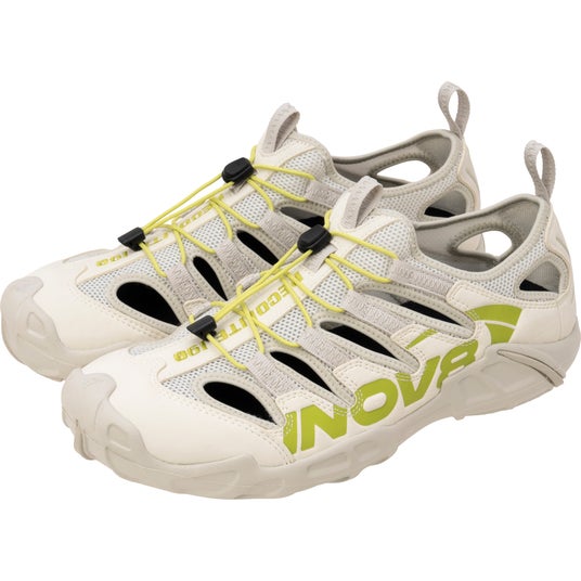 コラボレーションアイテムであるINOV8「RECOLITE 190 UNI(レコライト イチキュウゼロ ユニ」は、レースのビフォー&アフターに着用するリラックス・サンダルとして開発されたモデルです。わずか190g(27.0cm/片足)と軽量ながらかかと部分までしっかりホールドし、つま先やサイド部分の補強部材により岩や石などの侵入を防ぐことに考慮した設計になっています。踵部分は踏んで履くことができる仕様で、クイックシューレース構造が着脱を容易にし、水辺、アウトドア、日常使いまで幅広く活躍するモデルです。