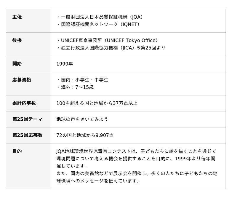 一般財団法人日本品質保証機構(東京都千代田区、理事長:石井 裕晶、略称:JQA)と国際認証機関ネットワーク(スイス・ジュネーブ、略称:IQNET)が主催し、UNICEF東京事務所(東京都渋谷区)と独立行政法人国際協力機構(東京都千代田区、略称:JICA)の後援(※)による「JQA地球環境世界児童画コンテスト」は、1999年より開催しております。