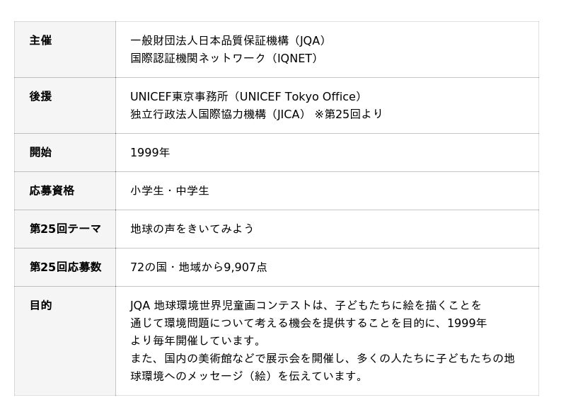 一般財団法人日本品質保証機構(東京都千代田区、理事長:石井 裕晶、略称:JQA)と国際認証機関ネットワーク(スイス・ジュネーブ、略称:IQNET)が主催し、UNICEF東京事務所(東京都渋谷区)と独立行政法人国際協力機構(東京都千代田区、略称:JICA)の後援(※)による「JQA地球環境世界児童画コンテスト」は、1999年より開催しております。