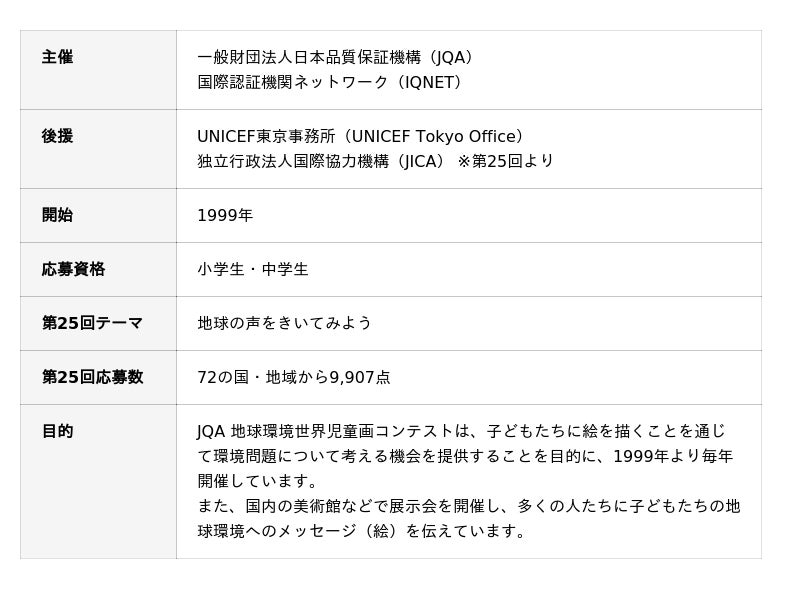 一般財団法人日本品質保証機構(東京都千代田区、理事長:石井 裕晶、略称:JQA)と国際認証機関ネットワーク(スイス・ジュネーブ、略称:IQNET)が主催し、UNICEF東京事務所(東京都渋谷区)と独立行政法人国際協力機構(東京都千代田区、略称:JICA)の後援(※)による「JQA地球環境世界児童画コンテスト」は、1999年より開催しております。