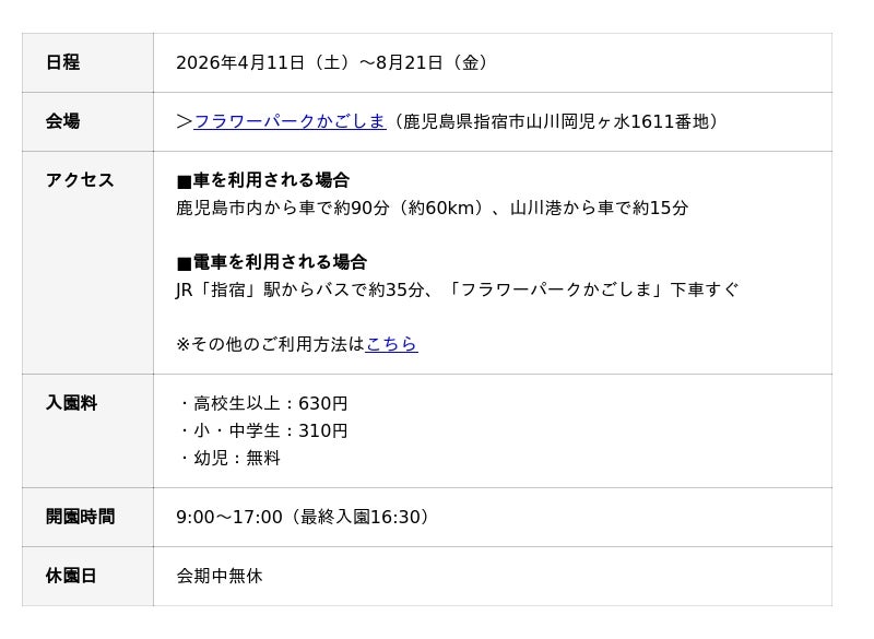 園内のギャラリーにて、第11回・第12回コンテストの優秀作品24点を展示します。世界中の子どもたちが自然や生きものをしっかりと見つめ、真剣な思いを込めて描いた作品は、どれも魅力あふれるものばかりです。また、国や地域、年齢、表現方法など、作品一つひとつに個性が光ります。会場となるフラワーパークかごしま(鹿児島県指宿市)は、温暖な気候を活かした世界各地の植物が楽しめる公園です。36.5 haもの広大な敷地には、さまざまな花や植物をはじめ、光・風・緑の空間を楽しめるエリアのほか、屋内庭園や温室など多彩な施設が備わっています。