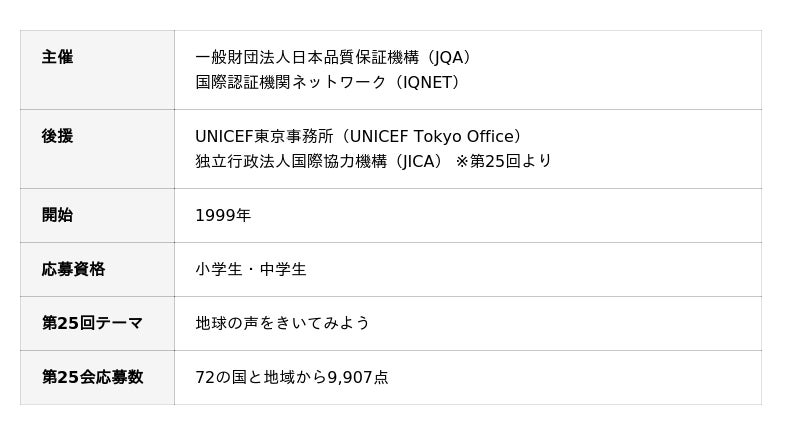 「JQA地球環境世界児童画コンテスト」は、子どもたちに絵を描くことを通じて環境問題について考える機会を提供することを目的に、UNICEF東京事務所(東京都渋谷区)と独立行政法人国際協力機構(東京都千代田区、略称:JICA)の後援(※)のもと1999年より毎年開催しています。また、国内の美術館などで展示会を開催し、多くの人たちに子どもたちの地球環境へのメッセージを伝えています。※JICAの後援は第25回より