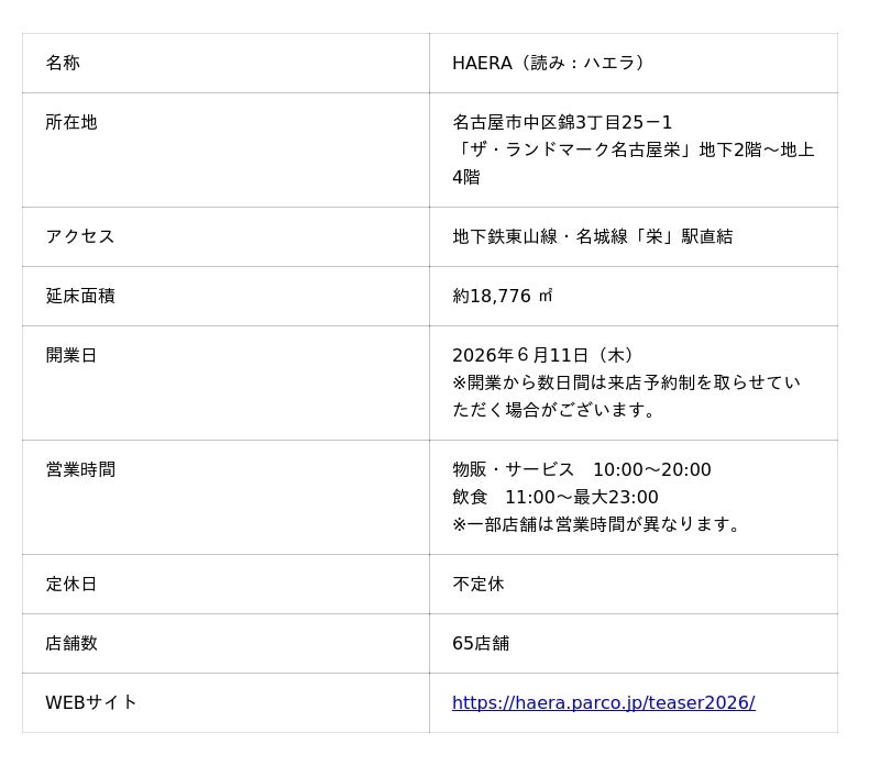 J.フロント リテイリング株式会社、株式会社パルコ、株式会社大丸松坂屋百貨店、J.フロント都市開発株式会社は、2026年6月11日(木)、「ザ・ランドマーク名古屋栄」の地下2階~地上4階にて、新たな商業施設「HAERA(ハエラ)」をグランドオープンいたします。