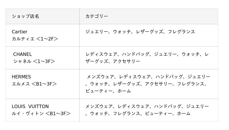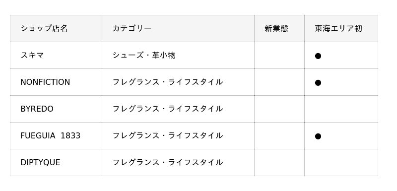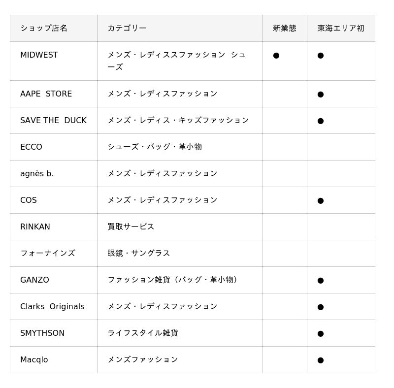 世界を代表するラグジュアリーブランドの旗艦店や、新たな文化を生み出すニュークラシックなファッションやライフスタイル提案の他、ハイグレードからカジュアルシーンまでを網羅したレストランやスイーツ等、東海エリア初上陸のショップも多数登場する全65ショップのラインナップとなります。