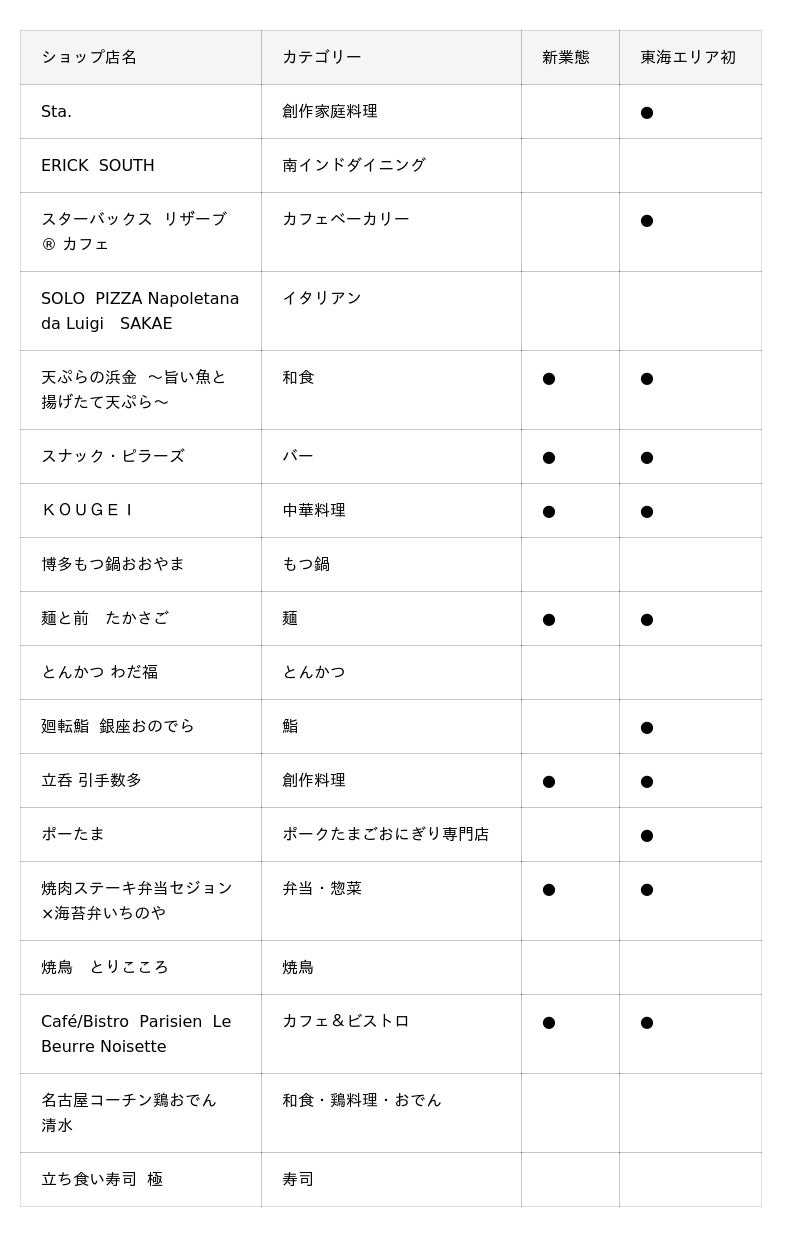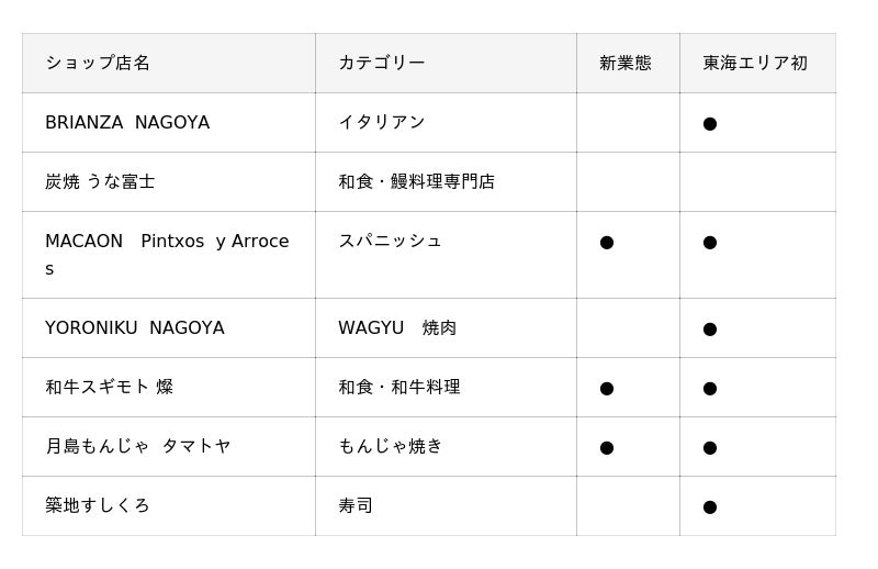 カジュアルシーンにもぴったりのレストランが軒を連ね、名古屋の名店や、東海エリア初出店の人気店が登場。