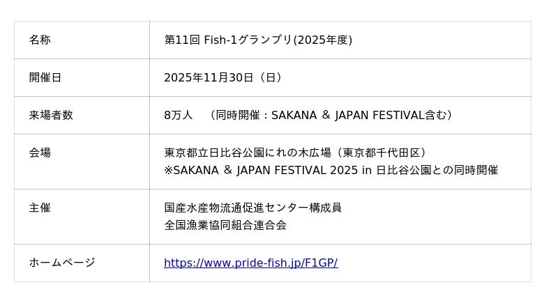 日本を元気にする「魚の祭典」「Fish-1グランプリ」は、日本の水産物に光を当てる「魚の祭典」です。2013年度から毎年度「Fish-1グランプリ」を開催(※)し、会場に来場した消費者に出品料理や商品を食べて投票してもらい、ステージや展示・体験ブースを通して、国産水産物の魅力を紹介してまいりました。今まで食べたことがなかった水産物に出会い、おいしさを知ってほしい。そして、知られざる国産水産物を使った料理や商品が新しい名物になって、地域の観光や産業の活性化につながってほしい。そんな願いをこめて、2013年度にスタートし、今回で開催11回目になりました。