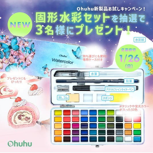 【SNSキャンペーン】Ohuhu新製品<固形水彩50色セット>が当たる!プレゼントキャンペーン開催中!