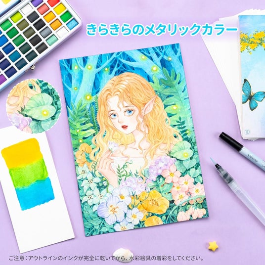 38色の基本色をベースに蛍光4色とメタリック8色のカラー展開。鮮やかな発色が魅力の固形水彩です。水彩紙やライナーペン、水筆ペン、スポンジ、パレット等が付属し、セット1つですぐに着彩が可能です。専用の収納ケースはコンパクトで、外出や旅行先への持ち運びにも便利です。