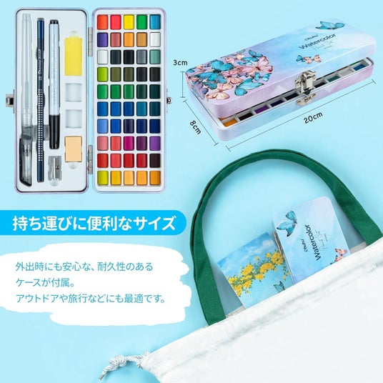38色のベースカラーに、4色の蛍光カラーや8色のメタリックカラーが揃います。Ohuhu画材の強みでもある、発色の鮮やかさも特徴です。水彩紙やアクリルライナーペン、水筆ペン、スポンジ、パレット等、必要な画材が一式揃っていて、いつでも気軽に絵を描くことができます。かわいいデザインの専用缶ケースがついており、贈り物としても人気のアイテムです
