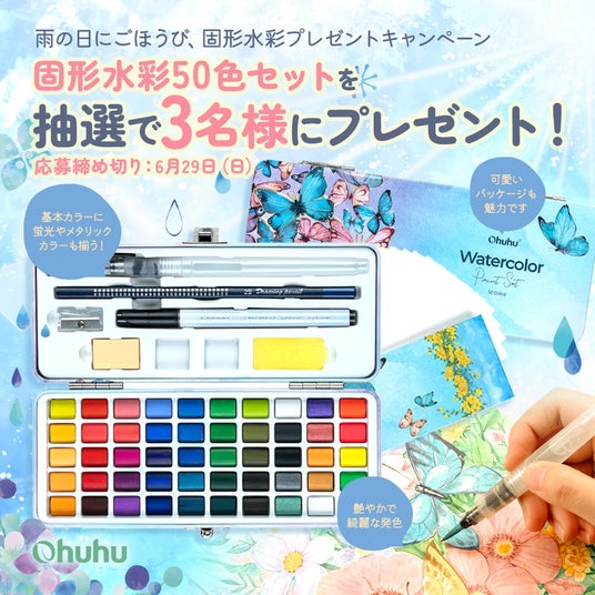 人気イラストマーカーや画材を展開するOhuhu(オフーフー)は、口コミでも高評価!話題のアイテム[固形水彩50色セット]が当たるキャンペーンを実施中です。じめっとした梅雨の季節に…さわやかな画材をぜひお試しください♪