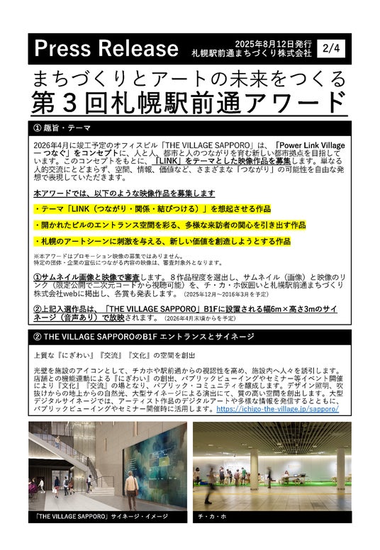 今回は、THE VILLAGE SAPPOROの「Power Link Village ― つなぐ」というコンセプトから、「LINK」をテーマとした映像作品を募集しており、選出された作品については、建設工事期間中のチ・カ・ホ仮囲いにサムネイルと映像のリンクを掲出予定です。「いちご賞」も予定しており、いちご賞を含む入選作品は、2026年4月の竣工後、THE VILLAGE SAPPOROのB1Fに設置される幅6m×高さ3mのサイネージで放映予定となっております。