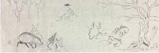 手漉き和紙絵巻『鳥獣戯画~手漉き和紙ができるまで~』は、国宝『鳥獣人物戯画』が伝わる京都 栂尾(とがのお)山 高山寺より許諾をいただき、手漉き和紙の原料となる楮やトロロアオイの栽培から、紙漉きの工程、流通までのイメージをお馴染みの動物たちを模して描いた巻物。