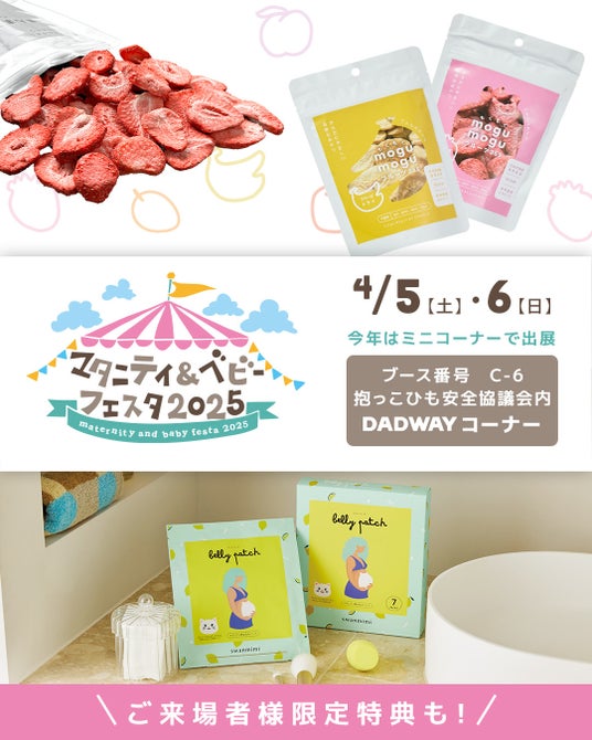 このほか、『VITALMEALS BY DADWAY(バイタルミールズバイダッドウェイ)』のフリーズドライのおやつ「もぐもぐフルーツ365」の試食サンプリングや、おしゃぶり、おくるみなどのベビーグッズの特価販売も行います。