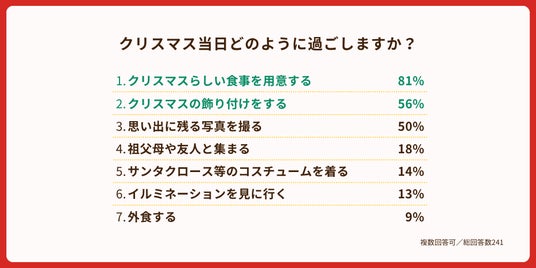当日の過ごし方として多くの方が楽しんでいるのは、「クリスマスらしい食事をする」(81.0%)と「クリスマスの飾り付けをする」(56.0%)でした。中にはオーナメントづくりをアクティビティとして行ったあとで飾り付けをするというエピソードを教えてくれた方も。“クリスマスならでは”を家族一緒に体験することが、定番の過ごし方であることがわかります。