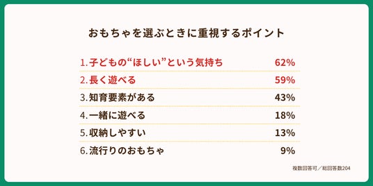 最も重視されたのは「子どもの“ほしい”という気持ち」(62.0%)と「長く遊べる」(59.0%)であり、この二大要素が拮抗する結果となりました。このことから、子どもの「今」の喜びと「将来」の成長を見据えたプレゼント選びをしていることが伺えます。さらに、「知育要素がある」(43.0%)も大きな関心を集めており、実用性への強い意識が表れています。一方で、「収納しやすい」(13.0%)や「流行りのおもちゃ」(9.0%)といった、利便性や一時的なトレンドは、主要な検討要素ではないことがわかります。