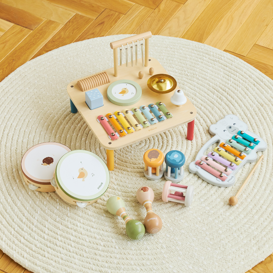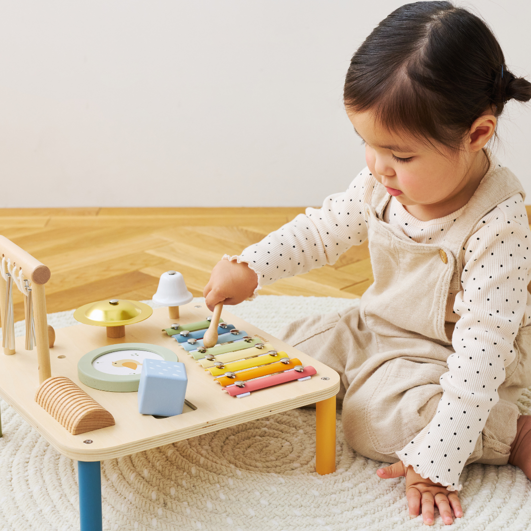 シロフォン・キューブラトル・ギロ・ドラム・チャイム・シンバル・ベルが付いたテーブル。音を楽しみながら、指先の器用さにつながる、たたく、ふる、こする、ゆらすなどの指先を使った遊びができます。音楽に合わせて音を鳴らして演奏ごっこをしたり、お友だちや家族と一緒に遊ぶのもおすすめです。