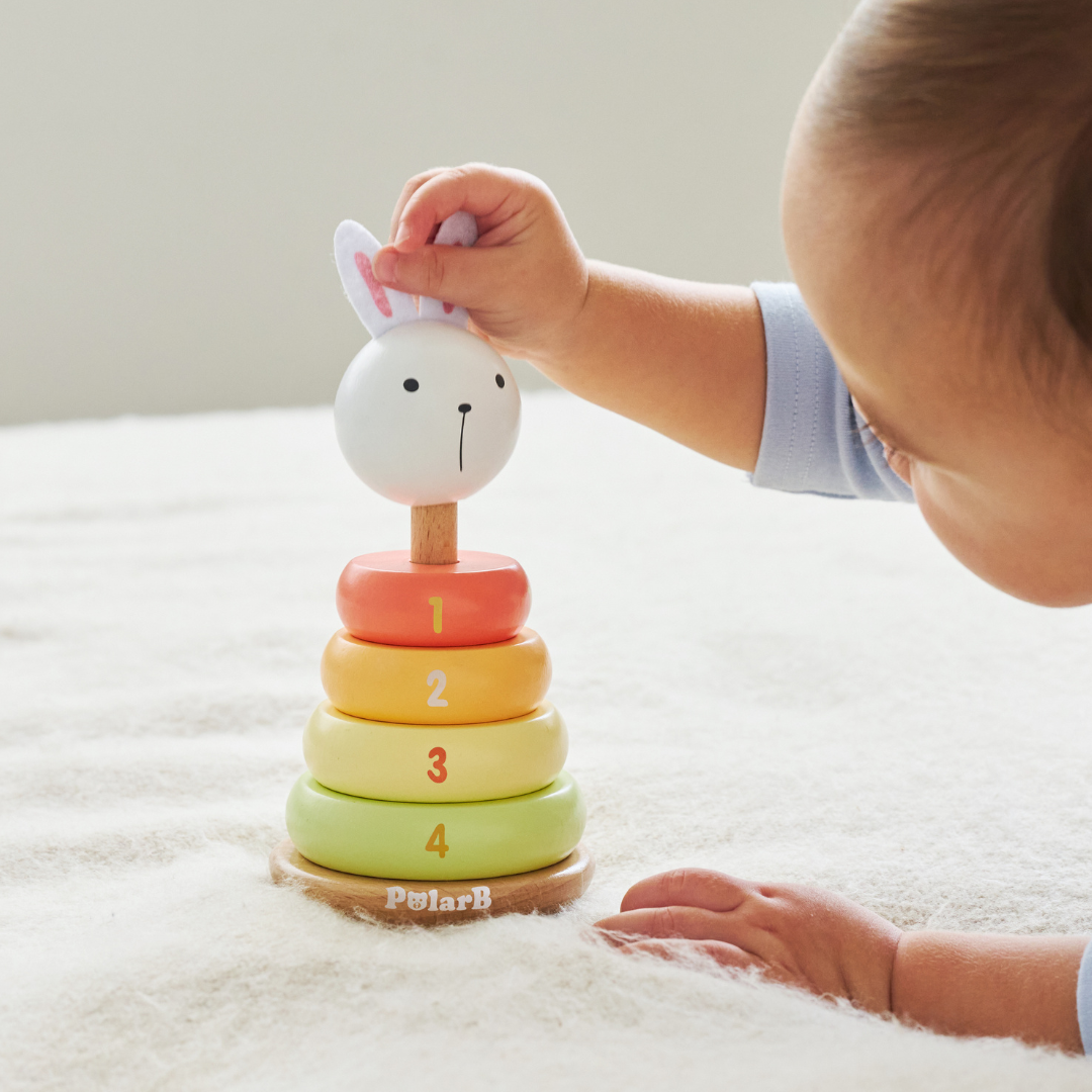 はじめての木のおもちゃにピッタリなスタッカー。手や指を上手に使って、リングを並べて、重ねて、ゆらして遊びます。リングには1~4の数字がデザインされており、遊びのなかで数に触れることも可能です。