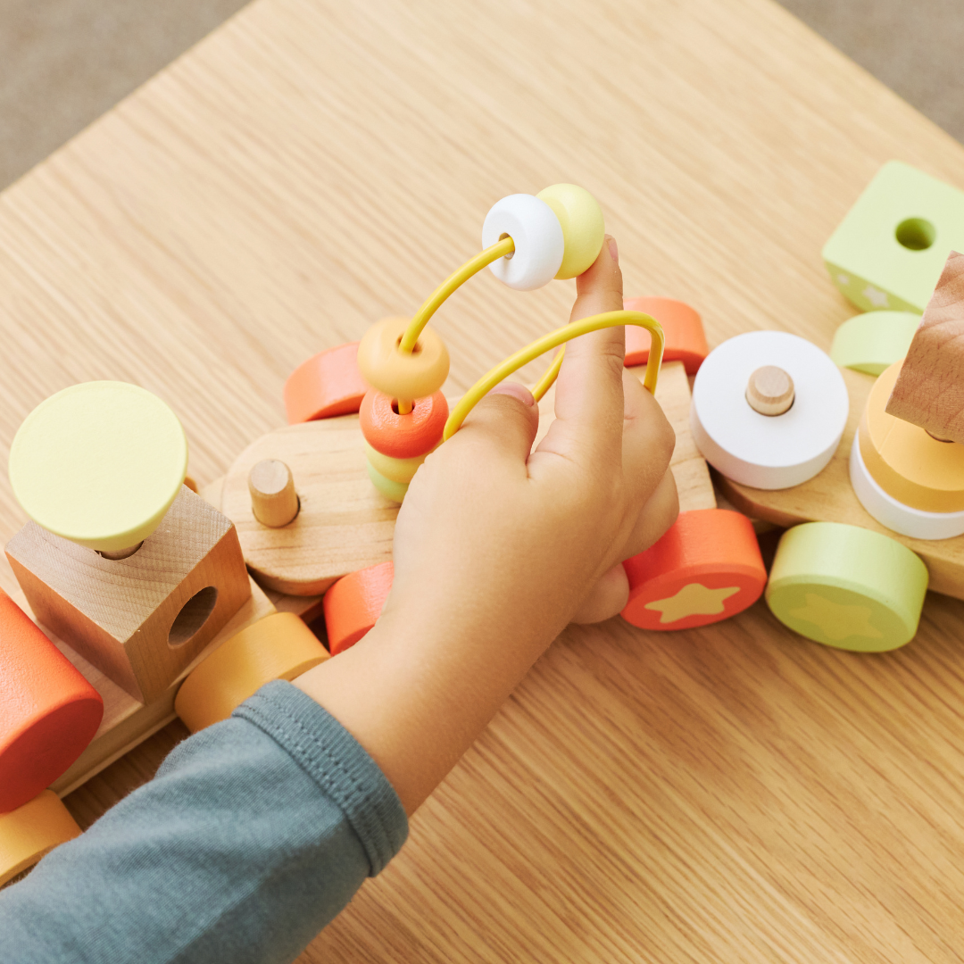 13個のブロック付きの、電車ごっこ・ルーピング・スタッキングが楽しめるおもちゃ。狙いを定めて積み木を棒にさす手と目の協応や、電車を動かすための腕や身体の使い方など、様々な知育要素が詰まっています。