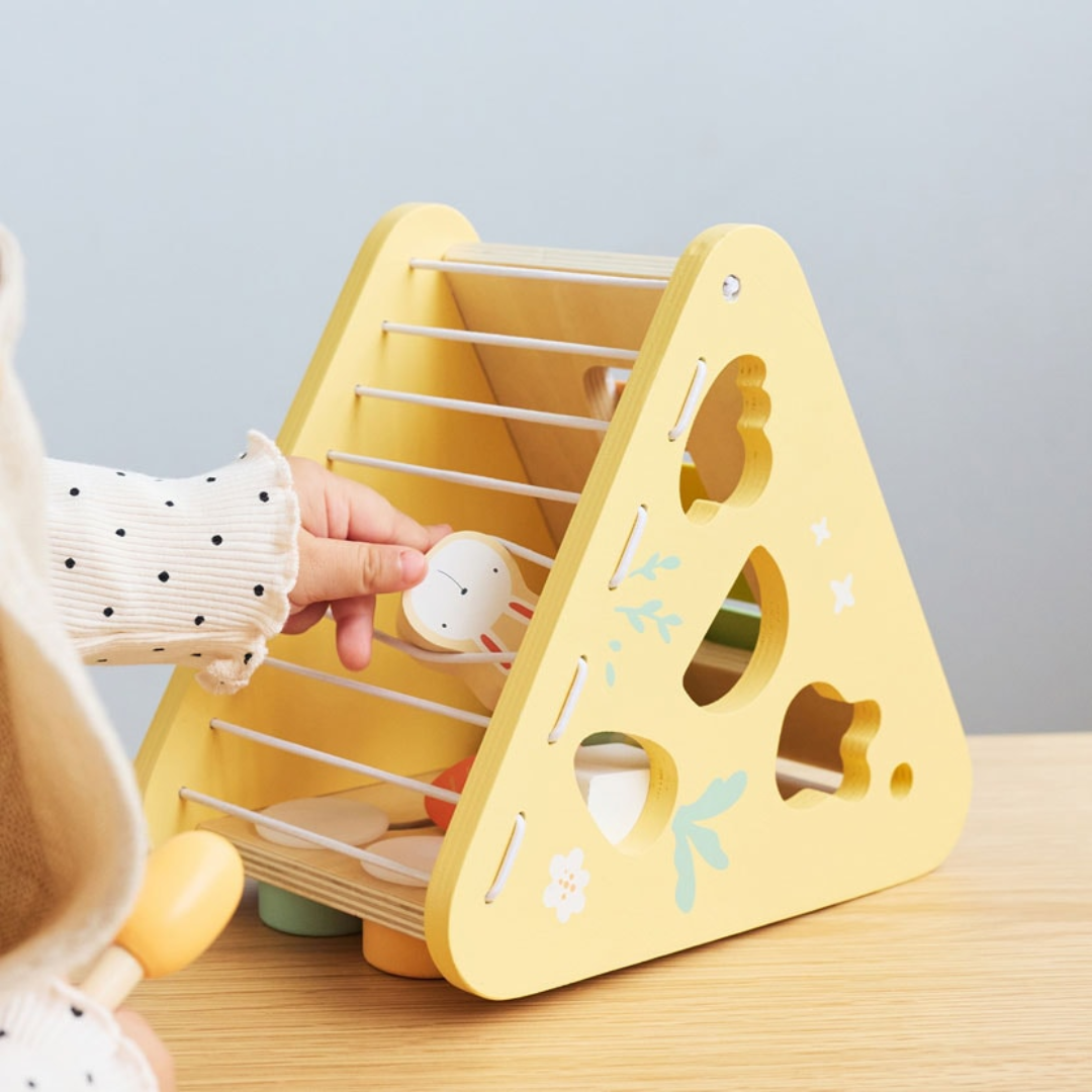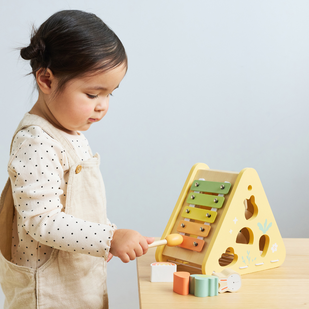 アクティビティボックスは、歯ぐるま・型はめブロック・ポットン落とし・鉄琴・迷路あそびと、指先の器用さを育む5つのあそびを楽しめるおもちゃ。じっくりと集中して楽しめます。