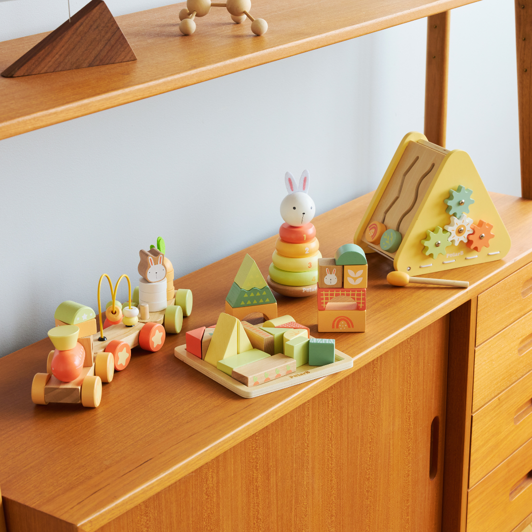 インテリアに馴染むやわらかなカラーと、遊びながら学べるしかけが特徴の木のおもちゃブランド『PolarB』。ダッドウェイ店舗のトイカテゴリーにおいて、クリスマス期に3年連続(2022年~2024年)売上No.1※を獲得した実績を持ちます。なかでも例年上位にランクインするのが、“ごっこ遊びおもちゃ”と“アクティビティボックス”です。今回の新商品には、これまでご好評いただいていた要素を活かしながら、絵本やカプセルトイなどでも見られるパンブーム、暮らしを彩るネオンカラーといった、日本のファミリーにおけるトレンドを落とし込みました。