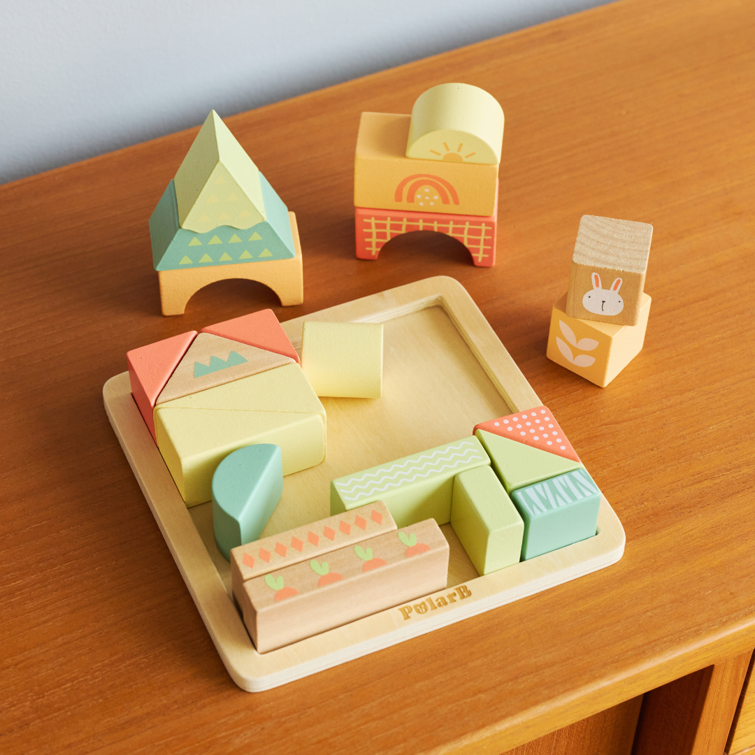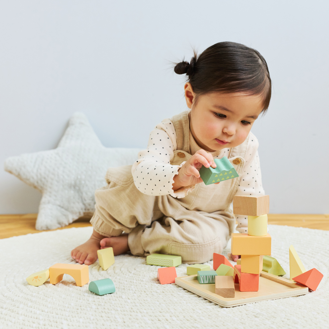 22ピースのつみきと木枠のセット。高く積んだり、車やおうちなどに見立てて組み上げたりと、お子さまの創造性を育むつみき遊びに加えて、パズルのように木枠にピースをはめて遊ぶことも。お子さまの小さな手でも握りやすいサイズです。
