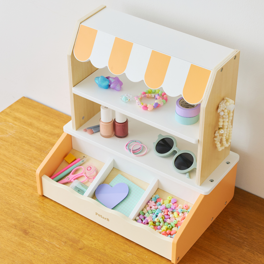 野菜などのお手持ちのアイテムと組み合わせれば、マルシェとして遊びが発展。大きくなったらアクセサリーなどの小物ラックとして使うこともでき、長くお楽しみいただけます。
