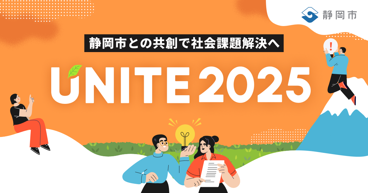 さらに共創を加速させる本年度事業「知・地域共創コンテスト『UNITE 2025』」では、静岡市が提示する社会課題テーマに加え、スタートアップが静岡市の課題解決に向けて自由に提案できる自由テーマから、社会課題解決に繋がる仕組みづくりの共創アイデアを募集。審査を経て選定された共創アイデアを元に、地域とスタートアップが一体となって課題解決・社会実装を目指します。