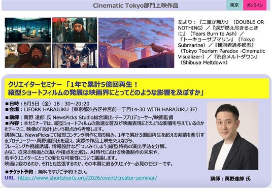 SSFF & ASIAは、東京都と連携し、「国内外の人々が東京を訪れたくなる」企画:多彩な「東京」の魅力を発信するプロジェクトとして、東京をテーマにしたショートフィルムを世界から公募する「Cinematic Tokyo部門」を2016年に設立。 今年も様々な「東京」が表現された5作品をCinematic Tokyo部門として上映、配信し、 優秀賞(東京都知事賞)を発表します。また、日本のクリエイター支援を目的に、NewsPicksにて縦型コンテンツ制作に取り組み、 1年で累計5億回再生を超える実績を牽引するプロデューサー・萬野達郎氏を迎え、「縦型ショートフィルムの急速な普及が映画表現にどのような影響を与えているのか」をテーマにクリエイターセミナーを開催します。