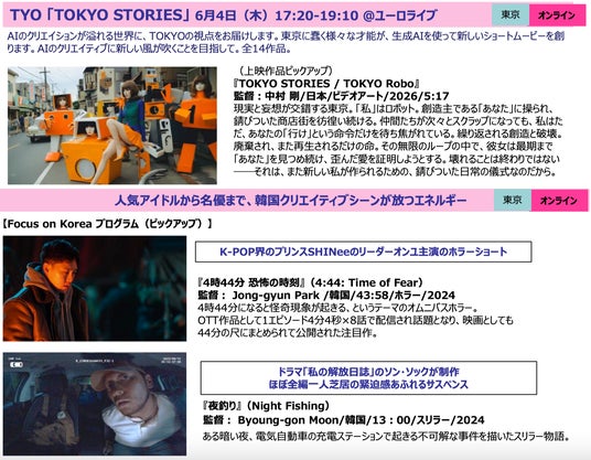 SSFF & ASIA 2026では、最先端の映像技術がショウケースされるとともに、人間だけが持つ五感で感じる映画・ショー 東京 オンライン トフィルムを考えます。生きるために必要な「食」に宿る人々の記憶のドラマ、視覚だけでなく、音や触感、嗅覚をもがインスパイアされる「アート」なショートフィルムは東京各会場でお楽しみいただけます。特に、畳敷きの空間と革新的な「アートプログラム」との融合は、これまでにない映画祭体験として感性を揺さぶります。※以下、東京=東京会場、 オンライン=オンライングランドシアター