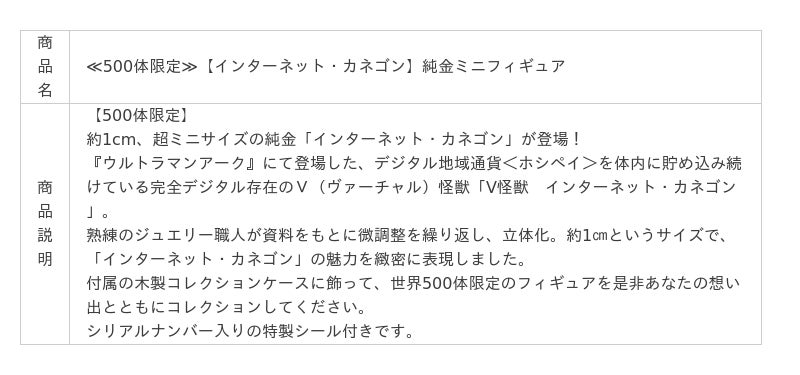 このたびの新作は、「ウルトラマンシリーズ」『ウルトラマンアーク』に登場した人気キャラクター「V怪獣 インターネット・カネゴン」の純金フィギュアです。熟練のジュエリー職人が資料をもとに約1cmのミニサイズながら、「インターネット・カネゴン」の魅力を緻密に表現しました。付属の木製コレクションケースに飾ってお楽しみいただけます。