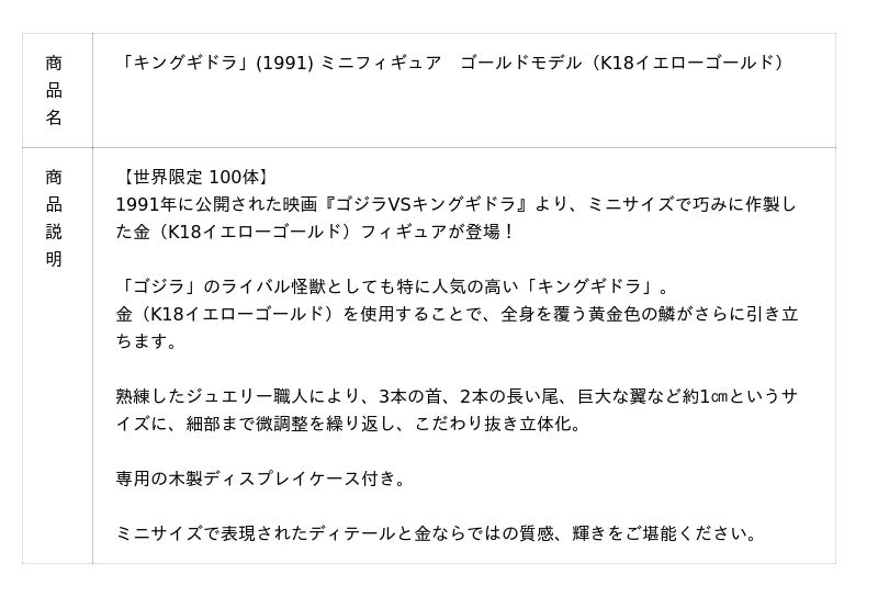 このたびの新作は、「キングギドラ」(1991)を立体化したK18イエローゴールド製のフィギュアです。3本の首、2本の長い尾、巨大な翼、全身を覆う黄金色の鱗など細部に至るまで微調整を繰り返し、こだわり抜いて再現しました。