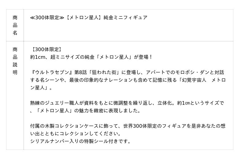 このたびの新作は、「ウルトラマンシリーズ」『ウルトラセブン』に登場した「幻覚宇宙人 メトロン星人」の純金フィギュアです。熟練のジュエリー職人が資料をもとに約1cmのミニサイズながら、「メトロン星人」の魅力を緻密に表現しました。足の裏には純金の証である「K24」の刻印を。付属の木製コレクションケースに飾ってお楽しみいただけます。