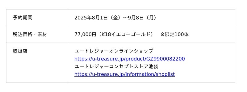 株式会社ユートレジャー(本社:東京都新宿区、代表取締役社長:青木 興一、株式会社ケイ・ウノの連結子会社)は、東宝株式会社とコラボレーションした『「メカゴジラ」(1974)ミニフィギュア ゴールドモデル』の予約受付を2025年8月1日(金)~9月8日(月)の期間、ユートレジャーオンラインショップ、ユートレジャーコンセプトストア池袋にて行います。100体の数量限定です。