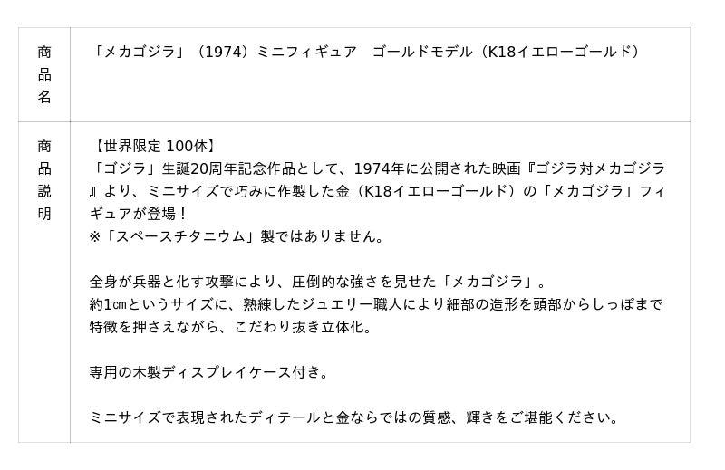金で甦る、史上最強のロボット怪獣「メカゴジラ」。全身が兵器と化す「メカゴジラ」の魅力をスペースチタニウムではなくK18イエローゴールドで表現!世界限定100体、9月8日(月)まで予約受付