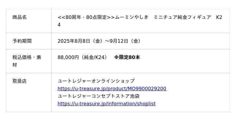 株式会社ユートレジャー(本社:東京都新宿区、代表取締役社長:青木 興一、株式会社ケイ・ウノの連結子会社)は、世界各国で長きにわたり人々に愛されている「MOOMIN(ムーミン)」とコラボレーションした「ミニチュア純金フィギュア」の予約受付を2025年8月8日(金)~9月12日(金)の期間、ユートレジャーオンラインショップ、ユートレジャーコンセプトストア池袋にて行います。80点の数量限定です。