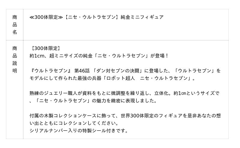 株式会社ユートレジャー(本社:東京都新宿区、代表取締役社長:青木 興一、株式会社ケイ・ウノの連結子会社)は、「ウルトラマンシリーズ」に登場する人気キャラクター「ニセ・ウルトラマンセブン」の「純金ミニフィギュア」を2025年8月25日(月)~10月6日(月)の期間限定で予約受付を行います。300体の数量限定です。