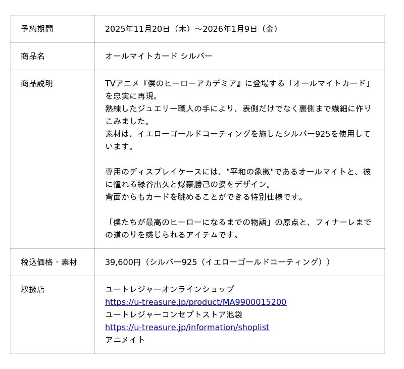 株式会社ユートレジャー(本社:東京都新宿区、代表取締役社長:青木 興一、株式会社ケイ・ウノの連結子会社)は、TVアニメ『僕のヒーローアカデミア』(原作:堀越耕平(集英社 ジャンプコミックス刊))とのコラボレーションアイテム「オールマイトカード」の予約受け付けを2025年11月20日(木)~2026年1月9日(金)の期間、ユートレジャーオンラインショップ、ユートレジャーコンセプトストア池袋にて行います。
