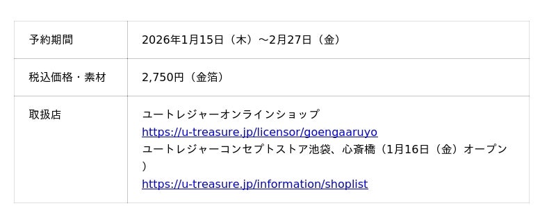 株式会社ユートレジャー(本社:東京都新宿区、代表取締役社長:青木 興一、株式会社ケイ・ウノの連結子会社)は、チロルチョコ株式会社のロングセラー商品「ごえんがあるよ」とコラボレーションした「金箔カード」の予約受け付けを2026年1月15日(木)~2月27日(金)の期間、ユートレジャーオンラインショップ、ユートレジャーコンセプトストア池袋・心斎橋(1月16日(金)オープン)にて行います。100枚の数量限定です。