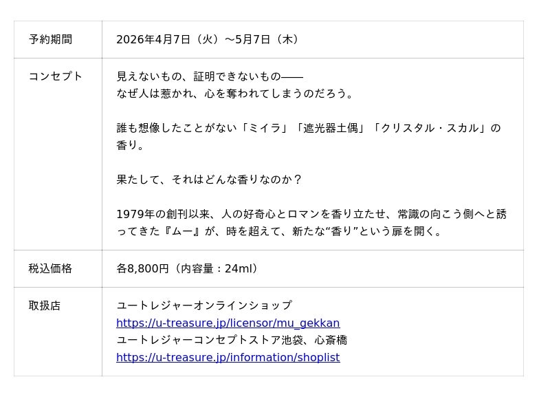 株式会社ユートレジャー(本社:東京都新宿区、代表取締役社長:青木 興一、株式会社ケイ・ウノの連結子会社)は、スーパーミステリー・マガジンムーとコラボレーションした香水(全3種類)の予約受付を、2026年4月7日(火)~5月7日(木)の期間、ユートレジャーオンラインショップ、ユートレジャーコンセプトストア池袋・心斎橋にて行います。ユートレジャーでは初めての取り扱いライセンスとなります。