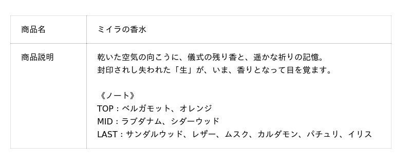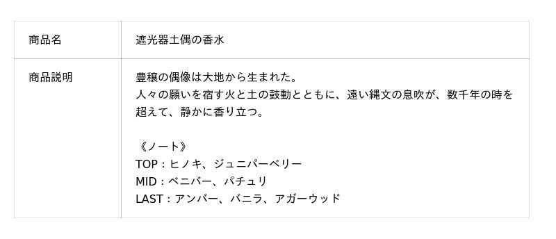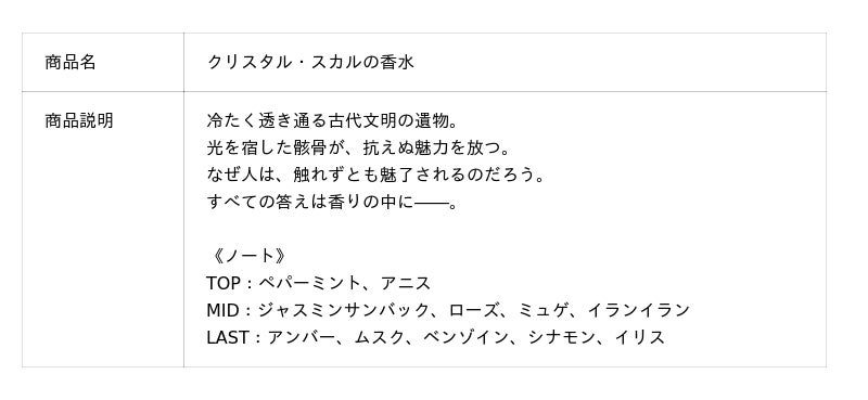 このたびの新作はスーパーミステリー・マガジンムーとコラボレーションした香水(全3種類)です。誰も想像したことがない「ミイラ」「遮光器土偶」「クリスタル・スカル」の香りをお届けします。(※世界初:自社調べ)