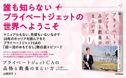 同文舘出版株式会社は、2024年11月29日に『プライベートジェットCAの品格と教養のまとい方――心を磨くおもてなしLesson――』(山崎充子 著)を発売しました。本書は、マニュアルもない、先輩もいないなかで18年のキャリアを積んできたプライベートジェットCAの「超一流のおもてなし」舞台裏エピソードを紹介しています。