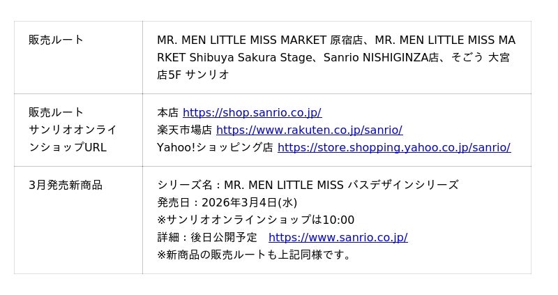 株式会社サンリオ(本社:東京都品川区、社長:辻 朋邦、以下サンリオ)は、英国の絵本から生まれたキャラクター「ミスターメン リトルミス」の日本初の旗艦店「MR. MEN LITTLE MISS MARKET 原宿店」を2026年2月13日(金)東京・原宿にオープンいたします。旗艦店は、人間の持つ様々な性格や特徴を表現するキャラクターたちと、「個性ってワクワク!」をテーマにした、遊び心あふれる世界観をお楽しみいただけます。ファッション、ライフスタイルにこだわったグッズをラインアップするほか、オープンを記念した数量限定のノベルティ配布を実施いたします。