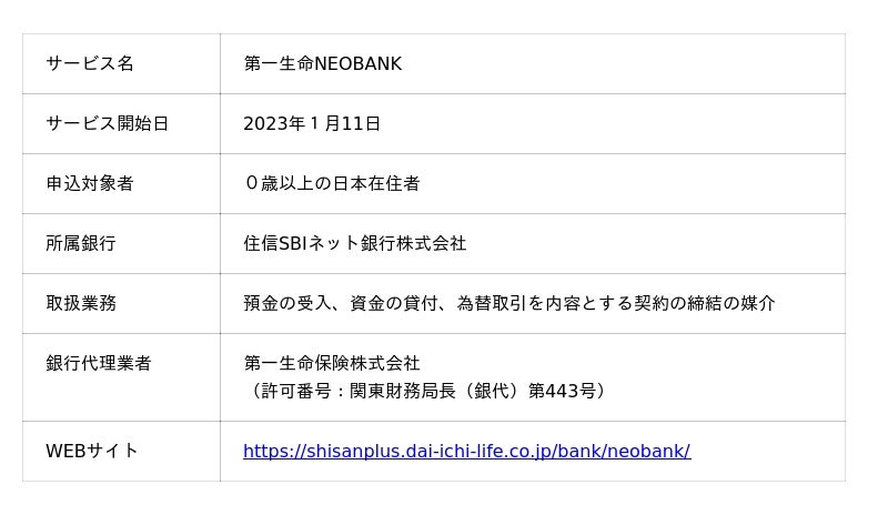 住信SBIネット銀行株式会社(本社:東京都港区、代表取締役社長(CEO):円山 法昭、以下「住信SBIネット銀行」)と、第一生命保険株式会社(代表取締役社長:隅野 俊亮、以下「第一生命」)が提供する「第一生命NEOBANK」にて、2025年12月1日(月)より「第一生命NEOBANK 新規口座開設キャンペーン」を開始いたします。